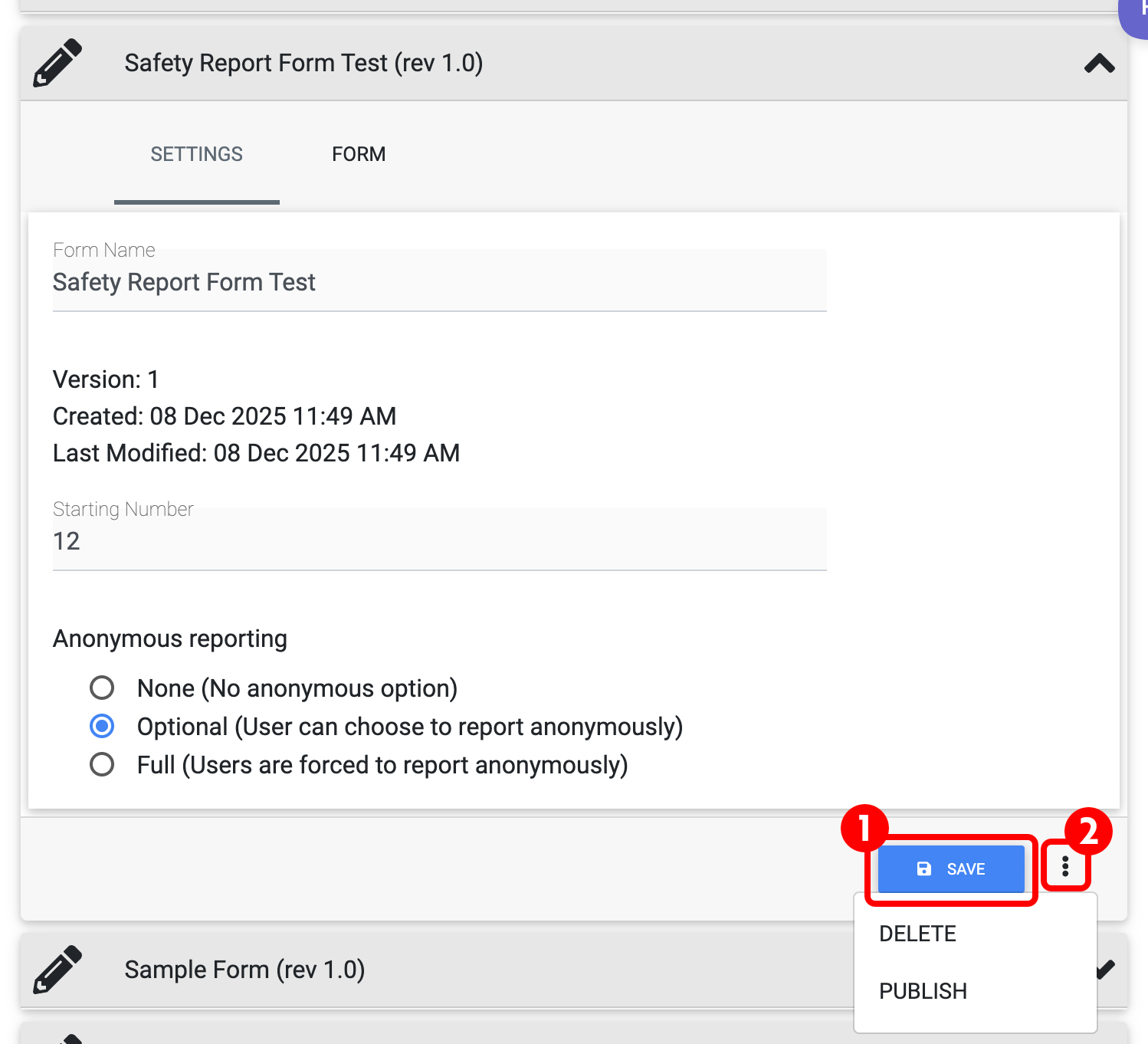When done editing, click "SAVE" (1) to save your report as a draft. When all edits are complete and you are ready to publish, click the ellipsis (2) and choose "PUBLISH" To delete or archive the report after publishing, use the ellipsis.