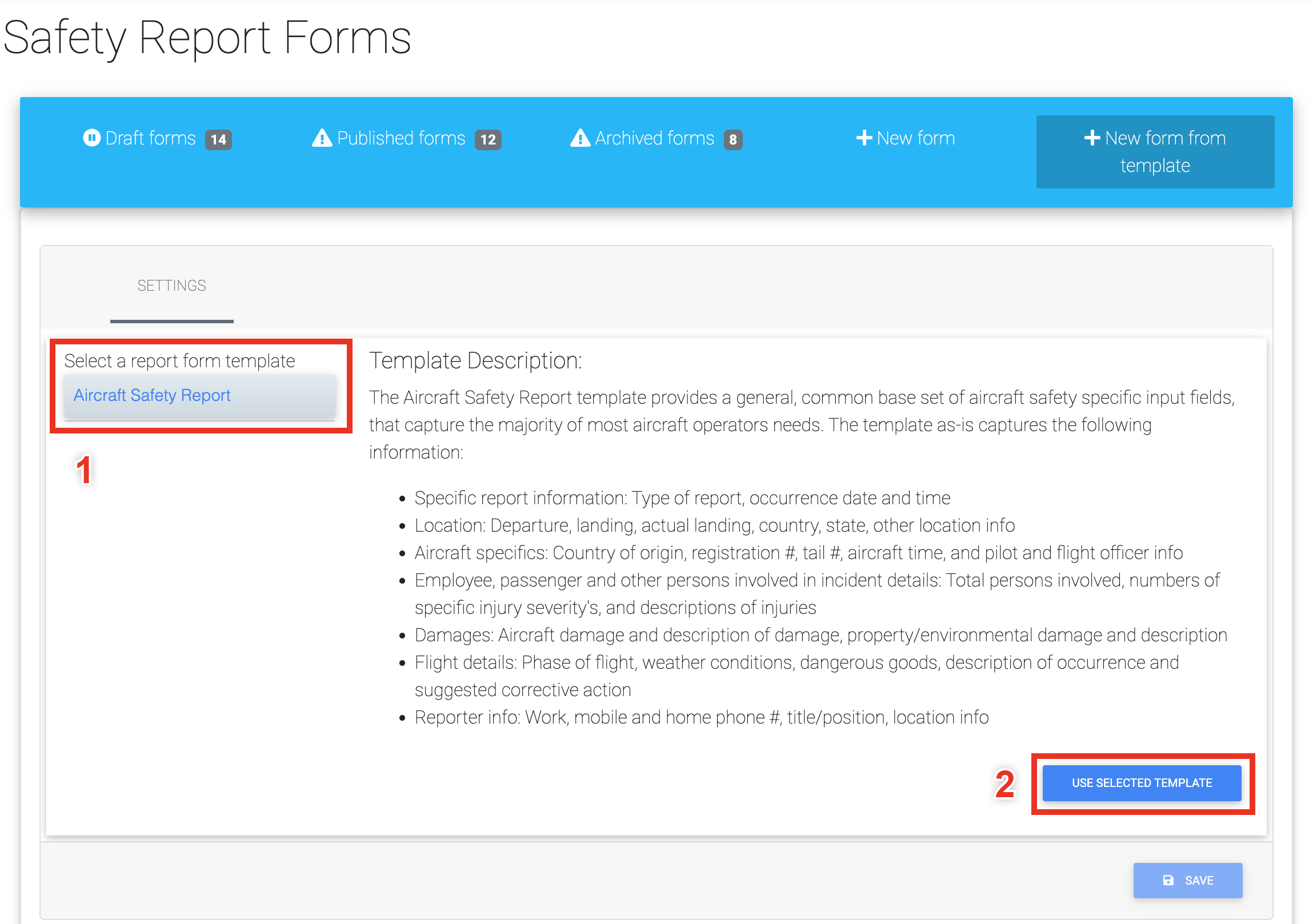 - Next, select the template you'd like to use to create your form (1) - this will provide a description of the template. Now click "USE SELECTED TEMPLATE" (2)