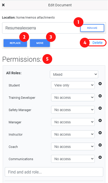 - Replace: Click on the Replace button, use the file-uploaded to add a new document. This will replace the current file with the new one.