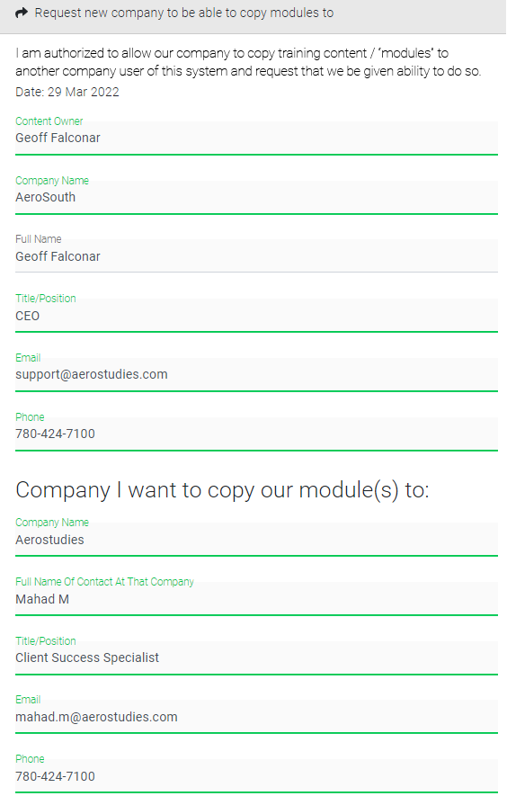 Note: Aerostudies employees must send a confirmation email to the recipient of the modules. Upon receiving an approval response, they will check off "Approve Agreement" at the correct destination learning center, ensuring the complete module transfer process.
