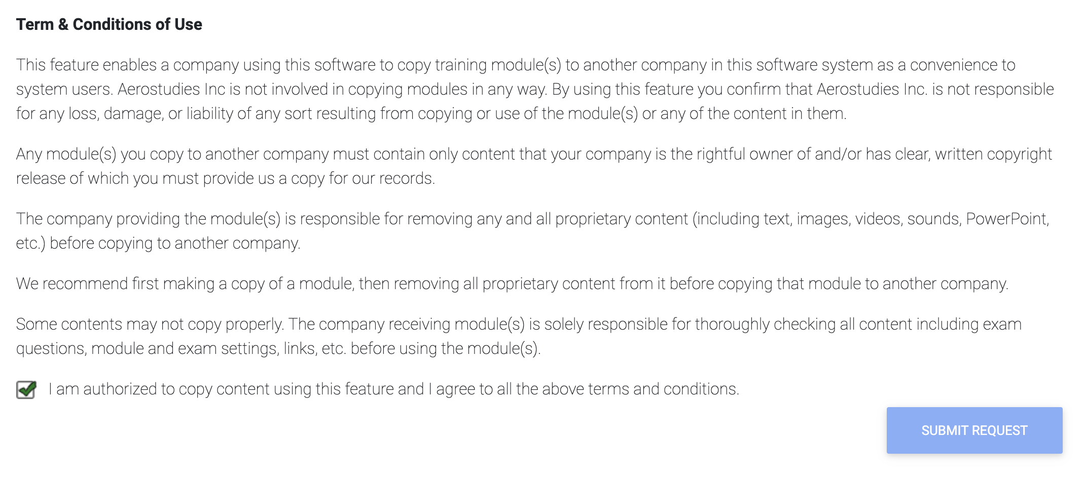 Please note: The recipient company will receive a fully editable copy of your module. It's recommended to protect yourself from liability issues by having a written agreement absolving you of liability for the content, trademarks, and other module-related matters. The software provider is not involved or responsible for any issues related to the content being copied.