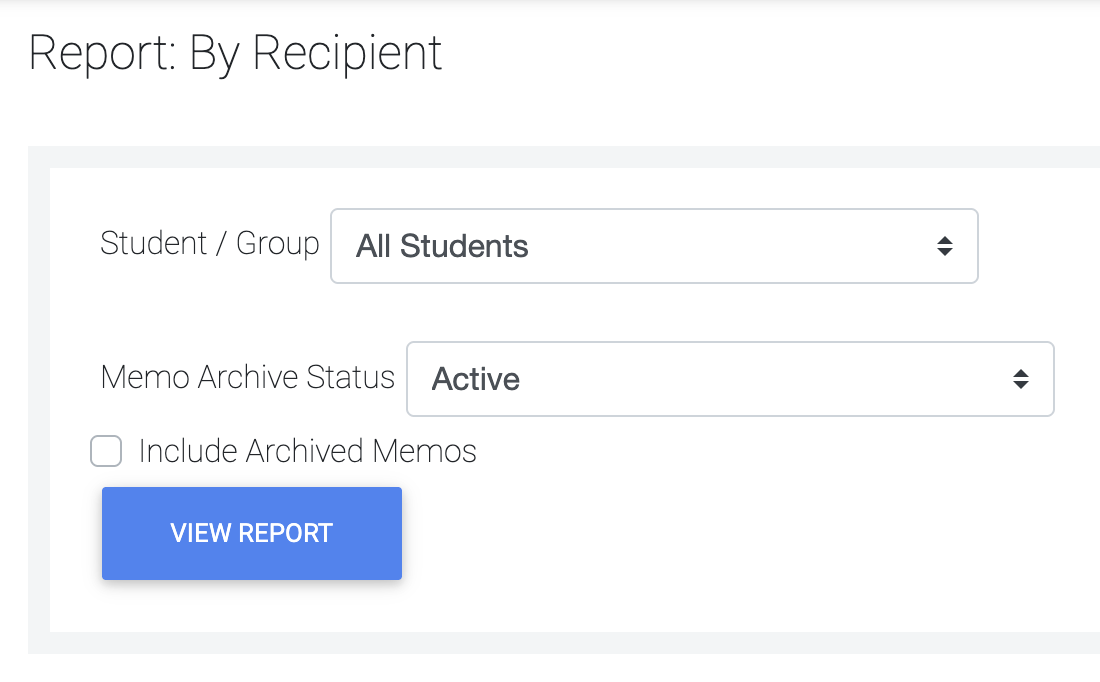 Clicking on the By Recipient report lets users retrieve a report of Memos sent directly to students or student groups. The report also includes the Memo status, and users can choose to include archived Memos.