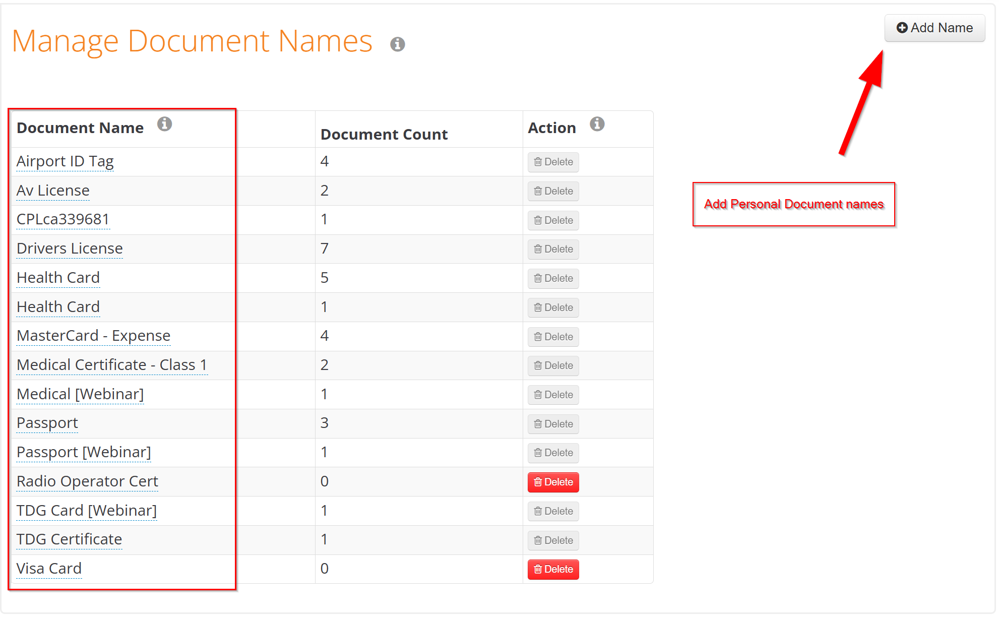 The names of the personal documents are managed in REGISTRAR/Settings/Customization tab. This is to prevent users from entering different personal documents that are not necessary for aviation operations.