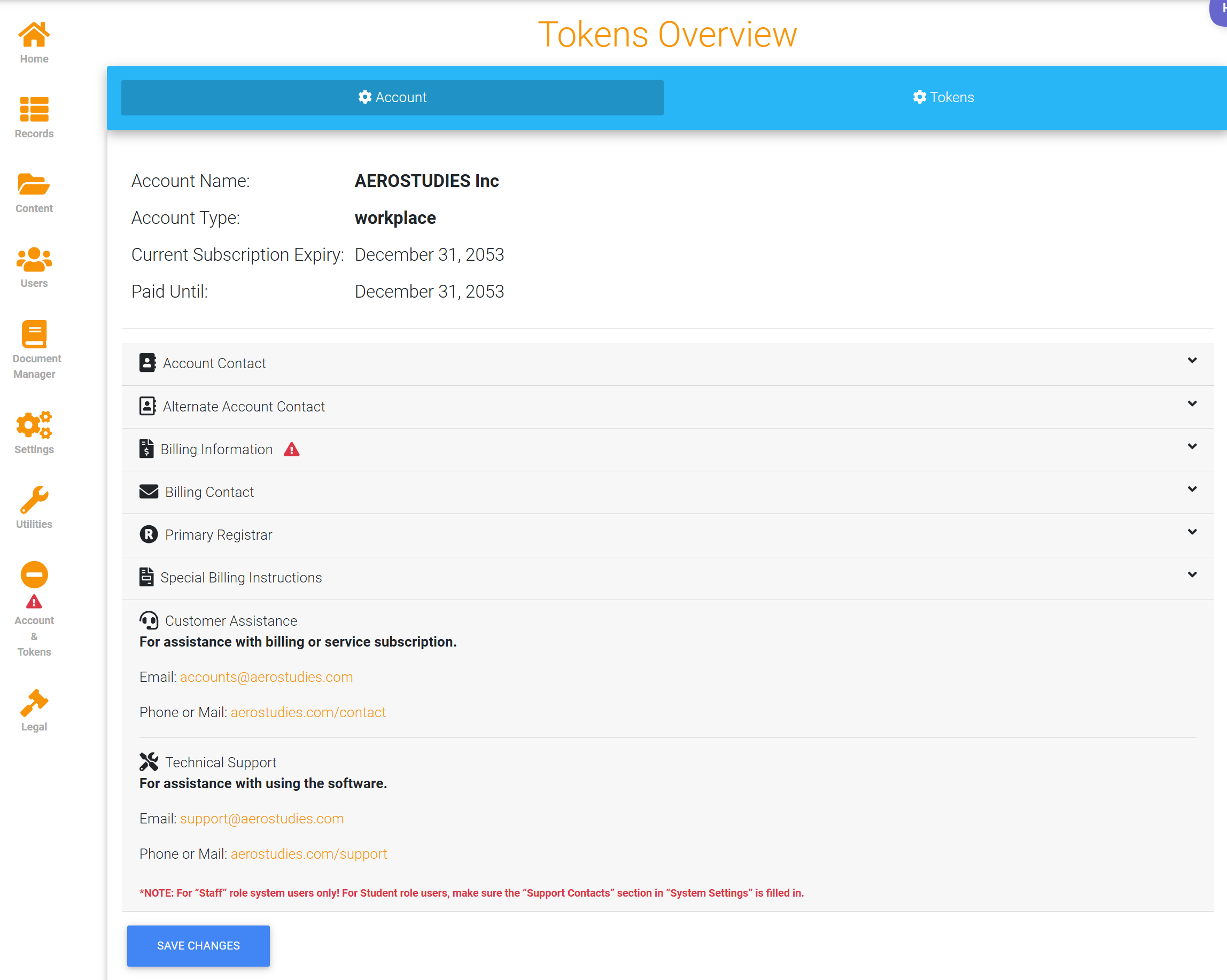 Note: If you notice a caution symbol located on your left-hand panel's 'Account & Tokens' button, please update the billing information section. Once its updated the caution symbol will dissapear.