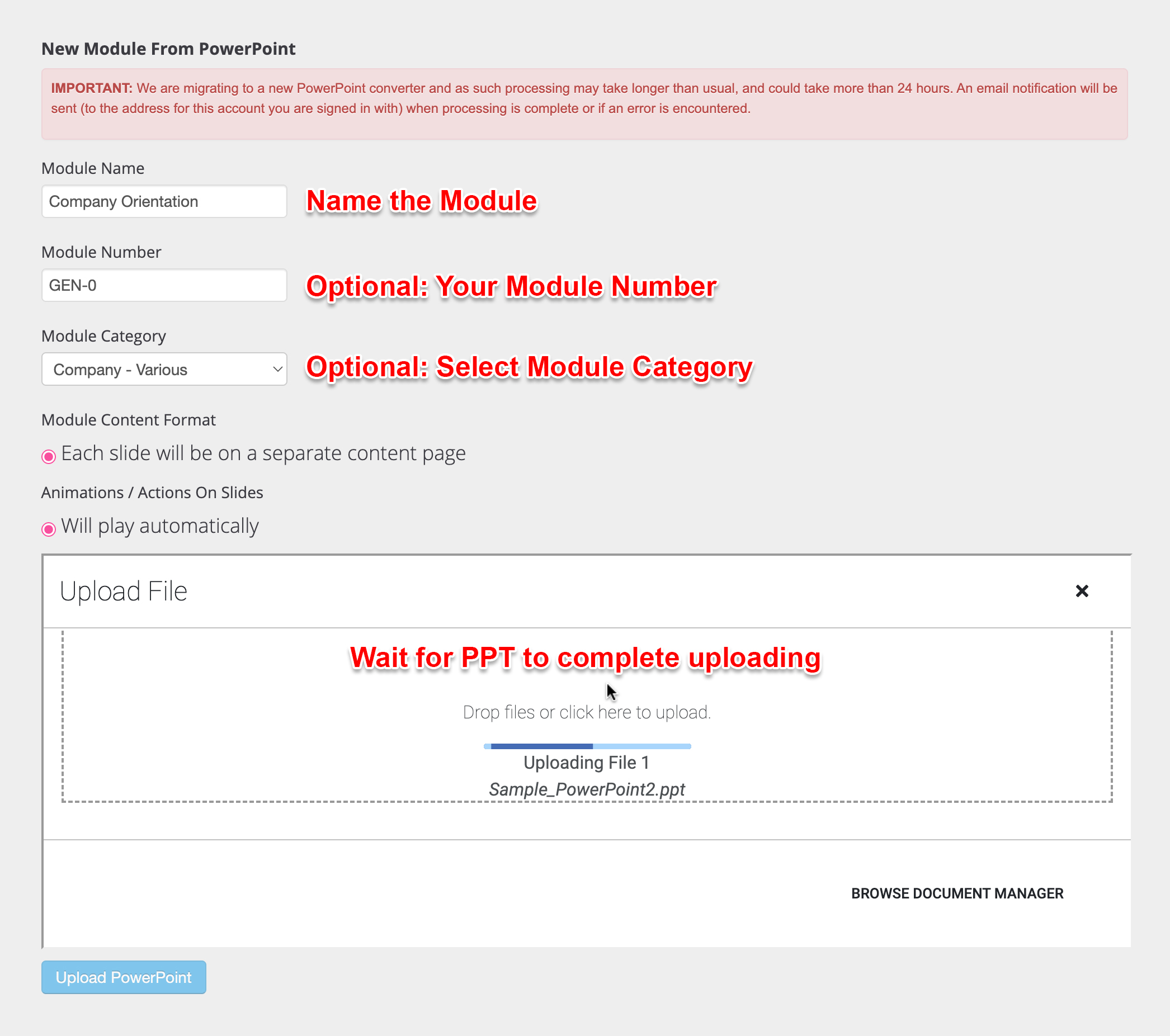 When the conversion is done, the new module will show in your 'Drafts' Modules page. The system will also send you an email notifying you when it is done. So you can go about other work while our system does the work of converting your PPT into an online training module.