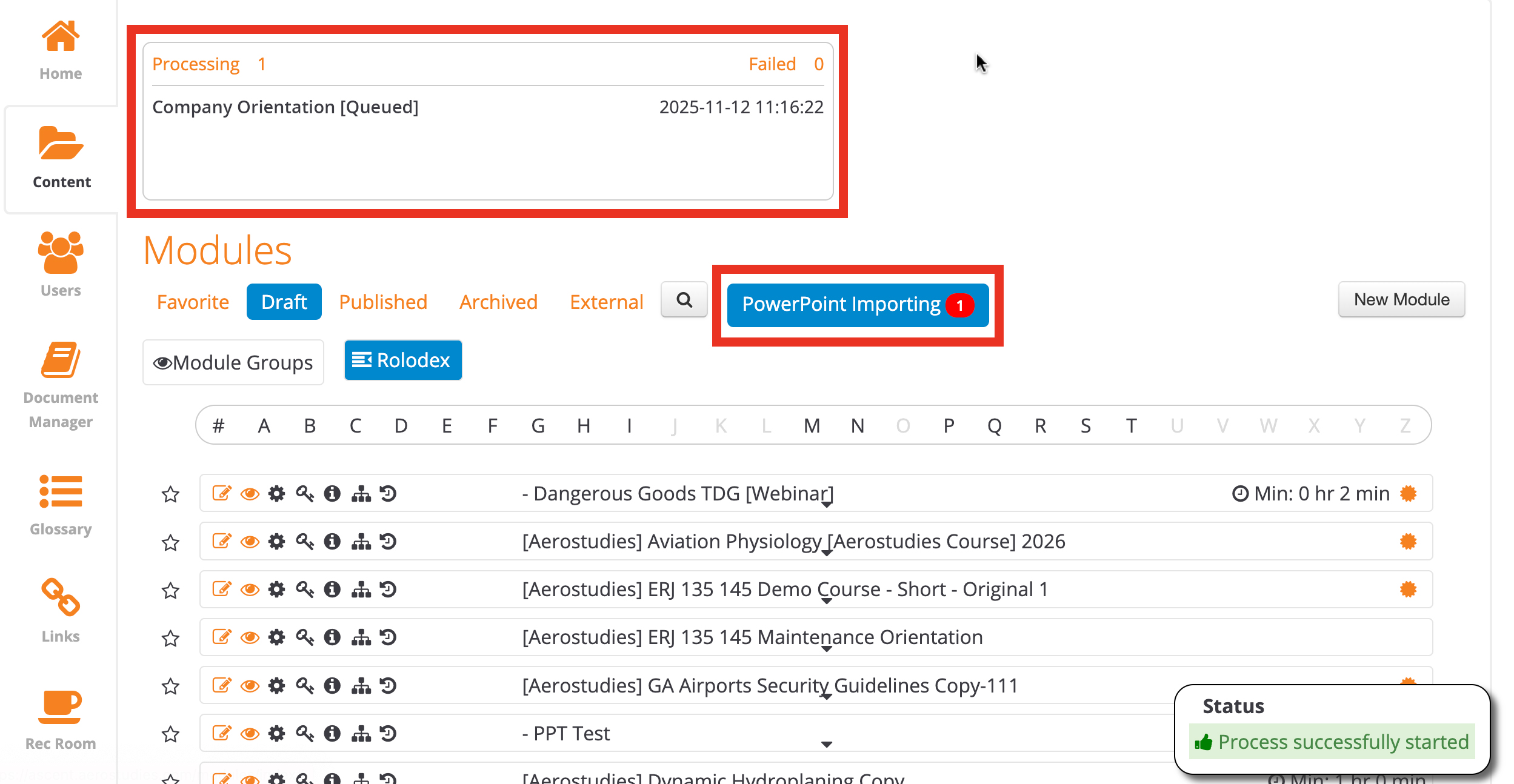 Once you have uploaded your PPT file, the system begins processing it to convert it to a new online Module. Depending on many variables, this can take anywhere from a couple minutes to about an hour. The status of the processing can be viewed in the PowerPoint 'Processing' window which will appear at the top of Modules page, or can be opened by clicking the 'PowerPoint Importing' link.